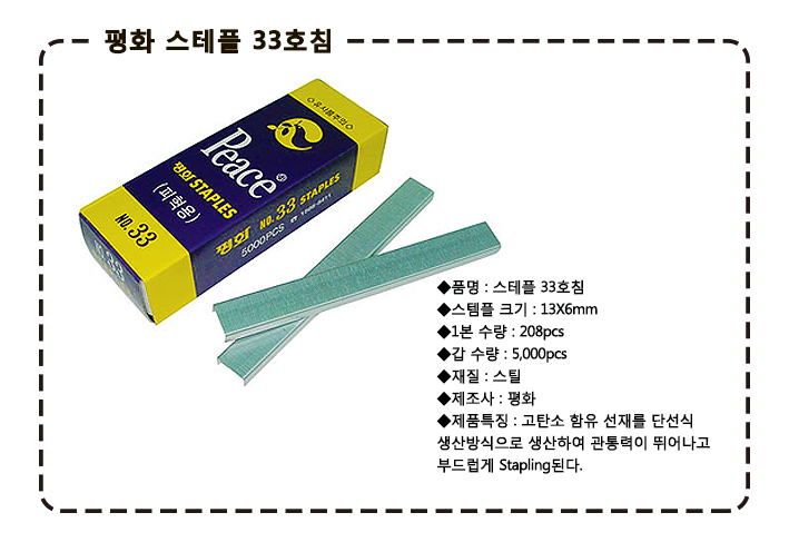 ◎ 상품 상세설명- 소량의 복사용지를 철하기 용이하며 표준 제품으로 고탄소 함유 선재를 사용- 관통력이 뛰어나고 부드럽게 스테플링이 된다- 20~25매◎ 상품정보고시■ 법에 의한 인증 사항 - 해당없음■ 제조국 또는 원산지 - 국산■ 수입여부 - 해당없음■ 안전인증여부 - N