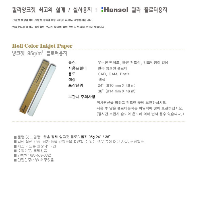 ■ 품명 및 모델명: 컬러플로터롤지(A0/95g/한솔)
