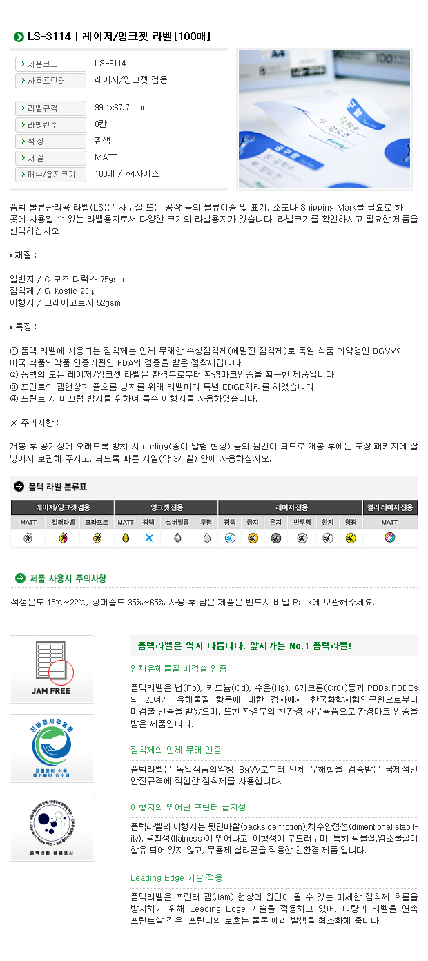 ■ 품명 및 모델명: 물류관리용 라벨(LS-3114/100매/8칸/폼텍)