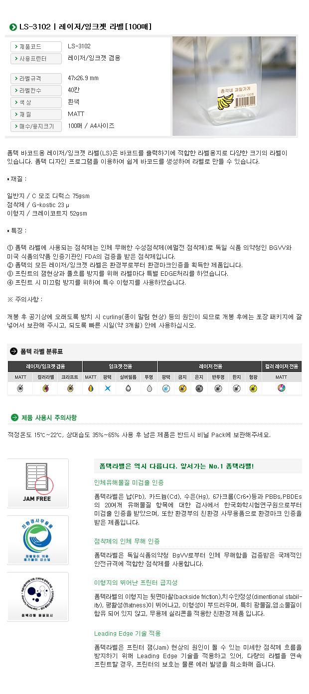 ■ 품명 및 모델명: 바코드용 라벨(LS-3102/100매/40칸/폼텍)
