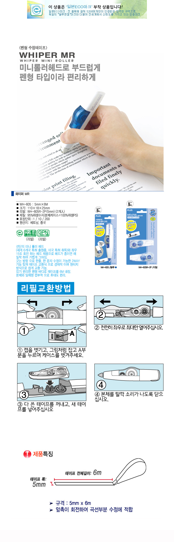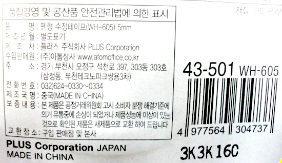 ■ 품명 및 모델명: PLUS수정테이프(WH-605/5*6) ■ 법에 의한 인증, 허가 등을 받았음을 확인할 수 있는 경우 그에 대한 사항: 해당없음 ■ 제조국 또는 원산지: 베트남or중국 ■ 수입여부: ㈜ 아톰상사 ■ 안전인증여부: N