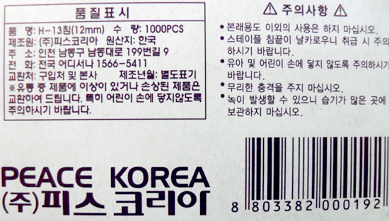 - 규격 : 12mm/1,000pcs, 80매- 제본용- 소용량지철(80매) ■ 품명 및 모델명: 스테플13호(12mm/평화) ■ 법에 의한 인증, 허가 등을 받았음을 확인할 수 있는 경우 그에 대한 사항: 해당없음 ■ 제조국 또는 원산지: 한국 ■ 수입여부: 해당없음 ■ 연락처: 1566-5411 ■ 안전인증여부: 해당없음