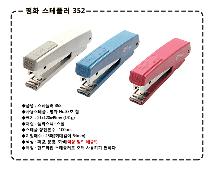 ◎ 상품 상세설명- 핸드타입 스테플러로 손에 들고 사용하기 편하다.◎ 상품정보고시■ 법에 의한 인증 사항 - 해당없음■ 제조국 또는 원산지 - 국산■ 수입여부 - 해당없음■ 안전인증여부 - N