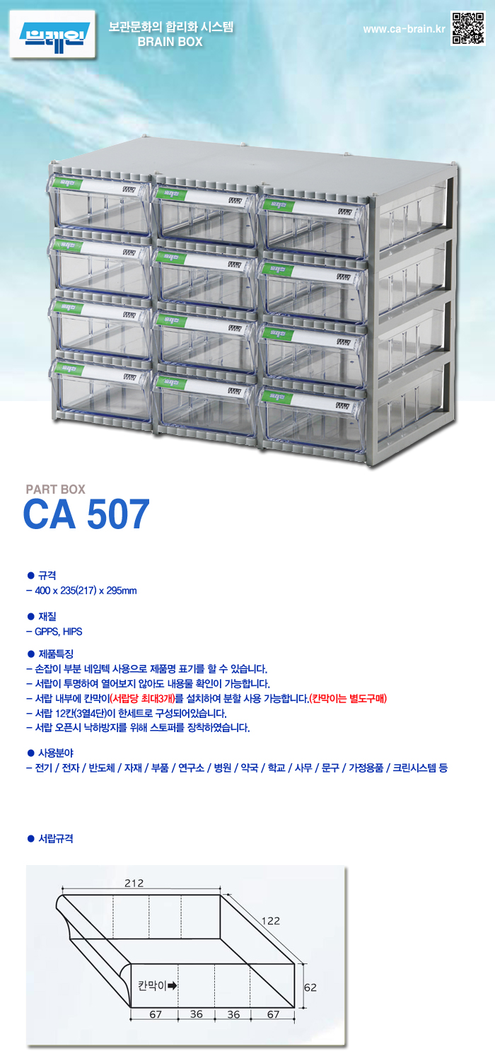 - 몸체색상 : 회색 - 서랍색상 : 투명 - NO. PA507 - 규격 : 가로 400mm, 세로 233mm, 높이 290mm ■ 품명 및 모델명: 다용도사물함(CA 507) ■ 법에 의한 인증, 허가 등을 받았음을 확인할 수 있는 경우 그에 대한 사항: 해당없음 ■ 제조국 또는 원산지: 대한민국 ■ 수입여부: 해당없음 ■ 안전인증여부: 해당없음
