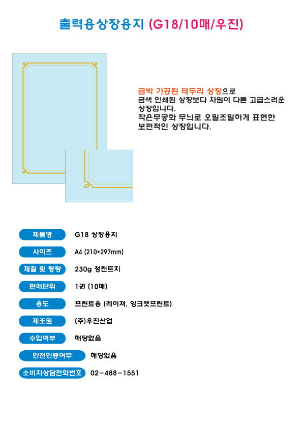 -상품정보고시 *품명및모델명 - 상장용지(돼지꼬리/10매/G18) *법에의한 인증 - 해당없음 *제조국or 원산지 - 대한민국 *수입여부 - 해당없음 *안전인증여부 - N