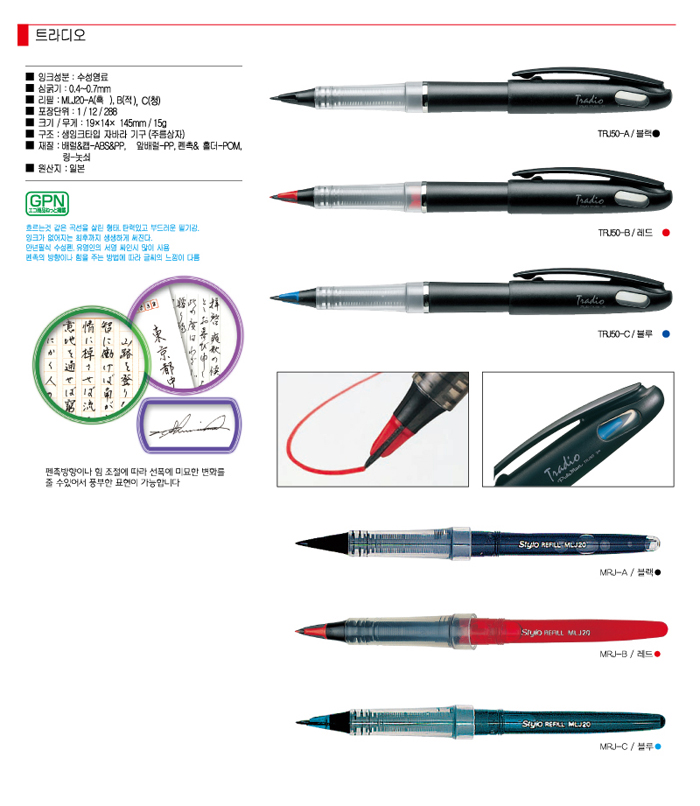 특징- 모델명 : TRJ50- 리필가능- 수성- 탄력있는 특수한 펜촉으로 필기감이 좋고 펜촉의 방향이나 힘을 주는 방법에 따라 글씨의 느낌이 다름 ■ 품명 및 모델명: 트라디오펜(적/0.8/TRJ50/1자루/PENTEL) ■ 법에 의한 인증, 허가 등을 받았음을 확인할 수 있는 경우 그에 대한 사항: 해당없음 ■ 제조국 또는 원산지: 일본 ■ 수입여부: ㈜ 아톰상사 ■ 안전인증여부: N
