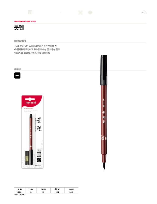 * 캡식 * 용도 : 붓글씨용, 방명록 싸인용 * 특수 수지제품의 붓촉사용 * 글씨의 굵기 마음대로 조절 * 내수성, 내광성이 우수하여 보존서류에 적합 ■ 품명 및 모델명: 붓펜(수성마킹펜/검정/모나미) ■ 법에 의한 인증, 허가 등을 받았음을 확인할 수 있는 경우 그에 대한 사항: 해당없음 ■ 제조국 또는 원산지: 태국 ■ 수입여부: 해당없음 ■ 안전인증여부: N