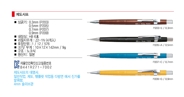 - 단위 : 1자루■ 품명 및 모델명: 제도샤프(P207/0.7/1자루/PENTEL) ■ 법에 의한 인증, 허가 등을 받았음을 확인할 수 있는 경우 그에 대한 사항: 해당없음 ■ 제조국 또는 원산지: 일본 ■ 수입여부: ㈜ 아톰상사 ■ 안전인증여부: 04◆B441R271-7002