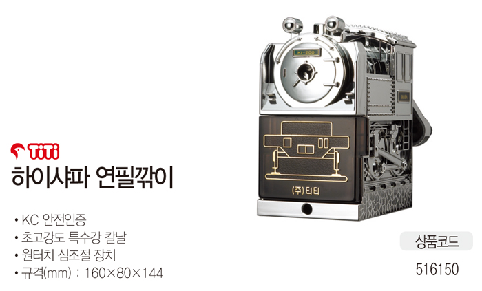 * 제조사 :티티경인 * 원산지 :중국 / 일본(날) * KC 안전인증 * 초고강도 특수강 칼날 * 원터치 심조절 장치 * 규격(mm) : 160X80X144 ■ 품명 및 모델명: 하이샤파연필깎이(KI-200) ■ 법에 의한 인증, 허가 등을 받았음을 확인할 수 있는 경우 그에 대한 사항: 해당없음 ■ 제조국 또는 원산지: 중국 ■ 수입여부: ㈜티티경인 ■ 안전인증여부: N