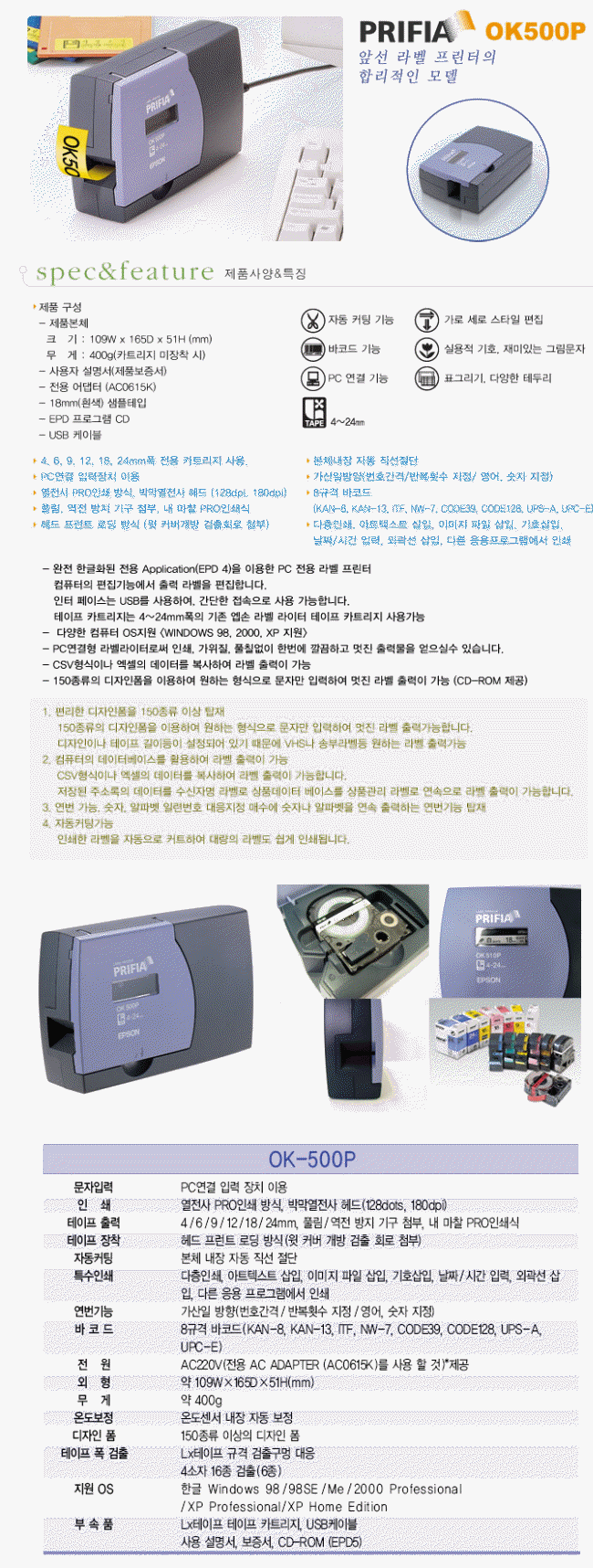 * 테이프출력 : 4/6/9/12/18/24mm, 느긋함/역전방지기구 부착