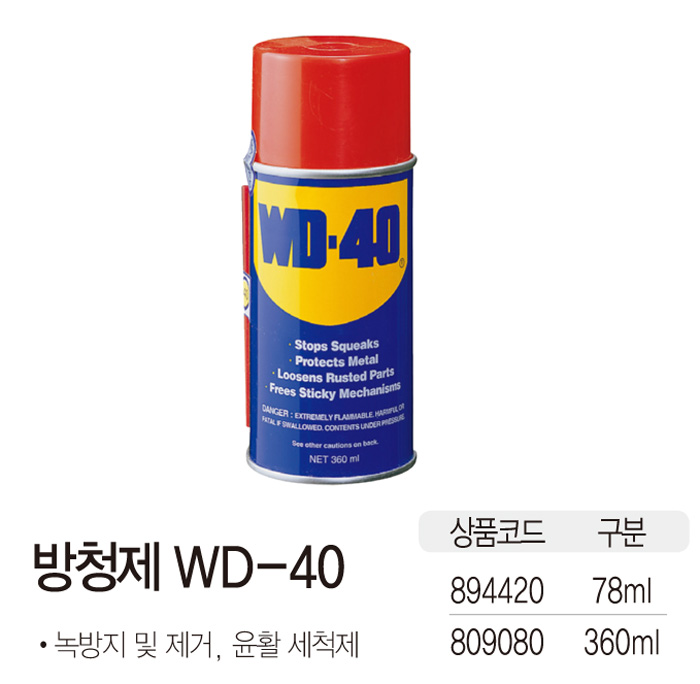 - 용량 : 360ml ■ 품명 및 모델명: 방청제(WD40/360ml) ■ 법에 의한 인증, 허가 등을 받았음을 확인할 수 있는 경우 그에 대한 사항: 해당없음 ■ 제조국 또는 원산지: 한국 ■ 수입여부: 해당없음 ■ 안전인증여부: N