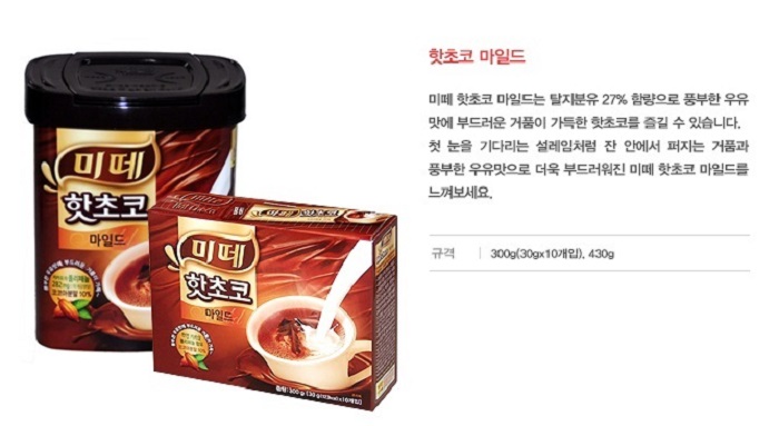 ■ 주원료, 원료산지: 코코아분말(네덜란드산)10%, 백설탕, 혼합분유(호주산)[탈지분유, 유청분말(우유)],포밍크리머(벨기에산)[물엿, 식물성경화유지, 탈지분유, 농축유단백, 제이인산칼륨],식물성크림(물엿, 식물성경화유지,카제인나트륨,제이인산칼륨,유화제),제삼인산칼슘,정제소금, 합성착향료(초콜릿향)