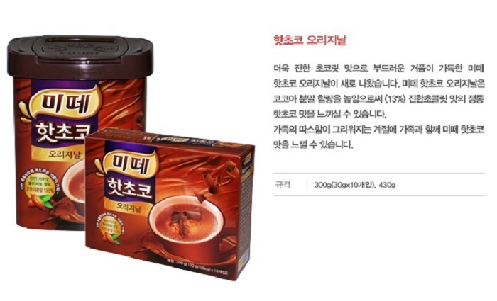 ■ 주원료, 원료산지: 코코아분말(네덜란드산)13.5%,백설탕, 혼합분유(호주산)[탈지분유, 유청분말(우유)],포밍크리머(벨기에산)[물엿, 식물성경화유지, 탈지분유, 농축유단백, 제이인산칼륨],식물성크림(물엿, 식물성경화유지,카제인나트륨,제이인산칼륨,유화제),제삼인산칼슘,정제소금, 합성착향료(초콜릿향)
