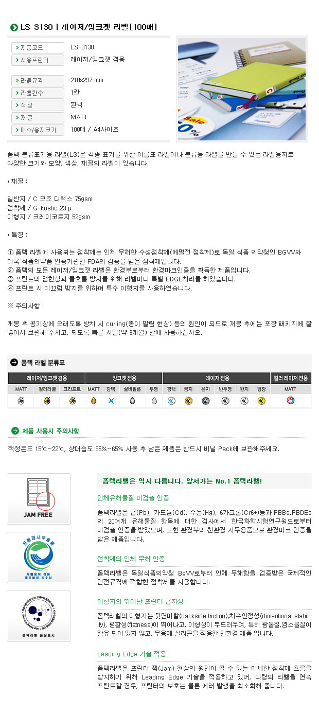 ■ 품명 및 모델명: 분류표기용 라벨(LS-3130/100매/1칸/폼텍)