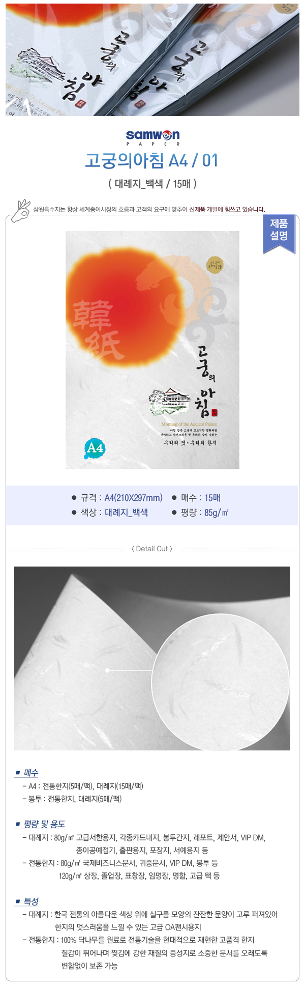 평량 및 용도: 80g - 고급서한용지, 각종 카드 내지, 봉투, 간지, 레포트, 제안서, VIP DM, 종이공예/접기, 출판용지, 포장지, 서예용지 등