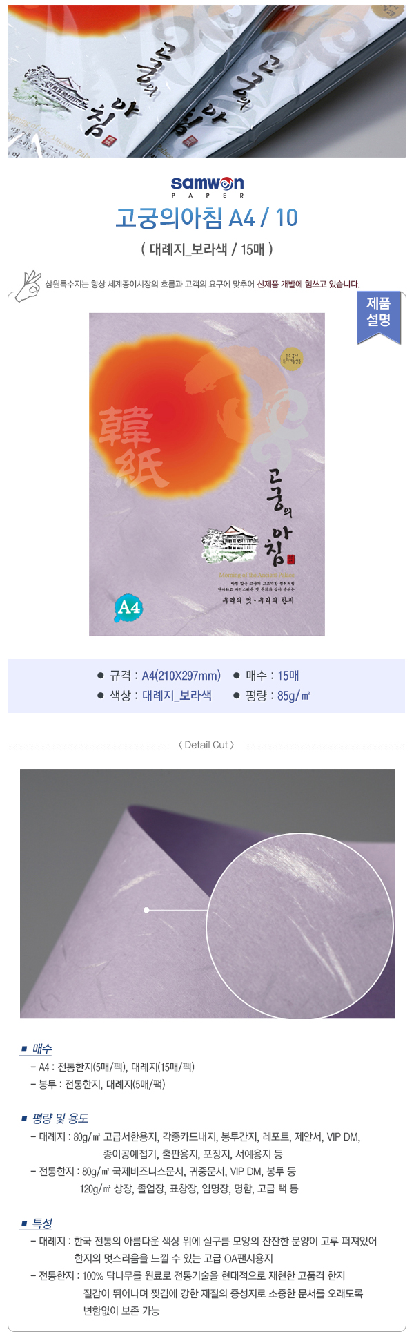 평량 및 용도: 80g - 고급서한용지, 각종 카드 내지, 봉투, 간지, 레포트, 제안서, VIP DM, 종이공예/접기, 출판용지, 포장지, 서예용지 등
