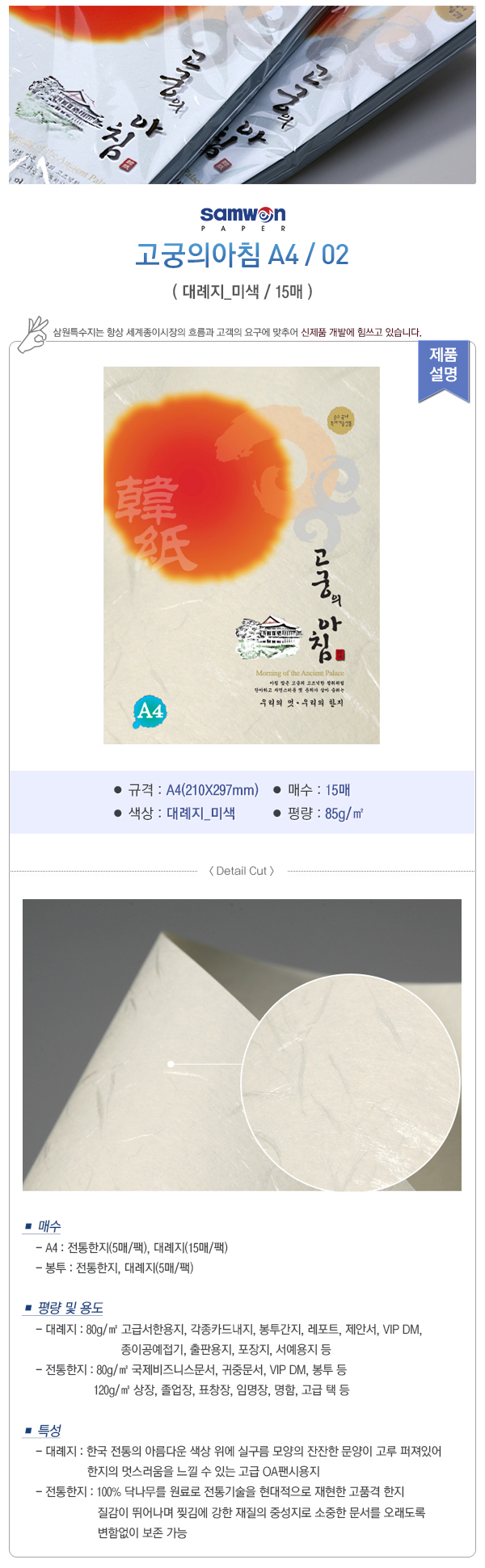 평량 및 용도: 80g - 고급서한용지, 각종 카드 내지, 봉투, 간지, 레포트, 제안서, VIP DM, 종이공예/접기, 출판용지, 포장지, 서예용지 등