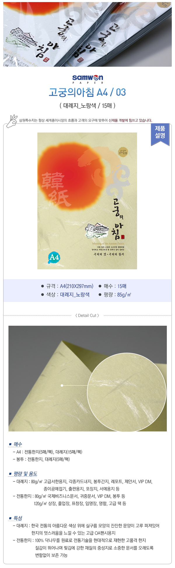 평량 및 용도: 80g - 고급서한용지, 각종 카드 내지, 봉투, 간지, 레포트, 제안서, VIP DM, 종이공예/접기, 출판용지, 포장지, 서예용지 등