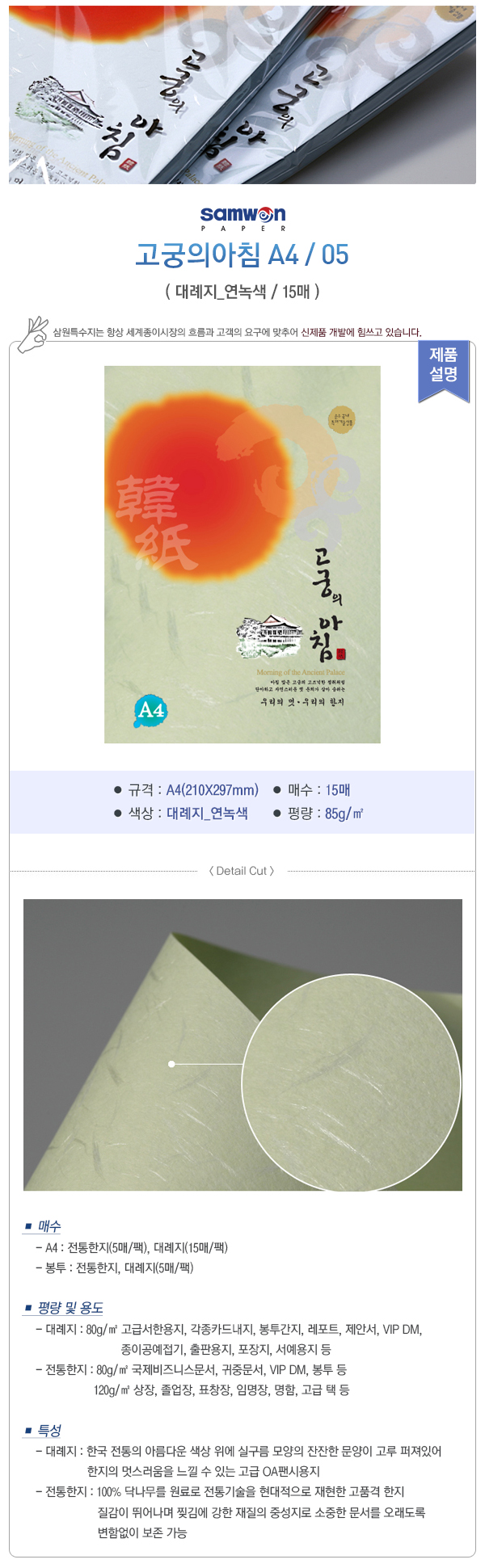 평량 및 용도: 80g - 고급서한용지, 각종 카드 내지, 봉투, 간지, 레포트, 제안서, VIP DM, 종이공예/접기, 출판용지, 포장지, 서예용지 등