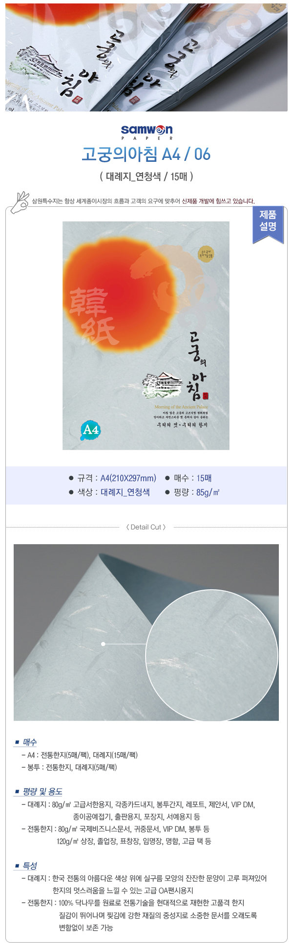 평량 및 용도: 80g - 고급서한용지, 각종 카드 내지, 봉투, 간지, 레포트, 제안서, VIP DM, 종이공예/접기, 출판용지, 포장지, 서예용지 등