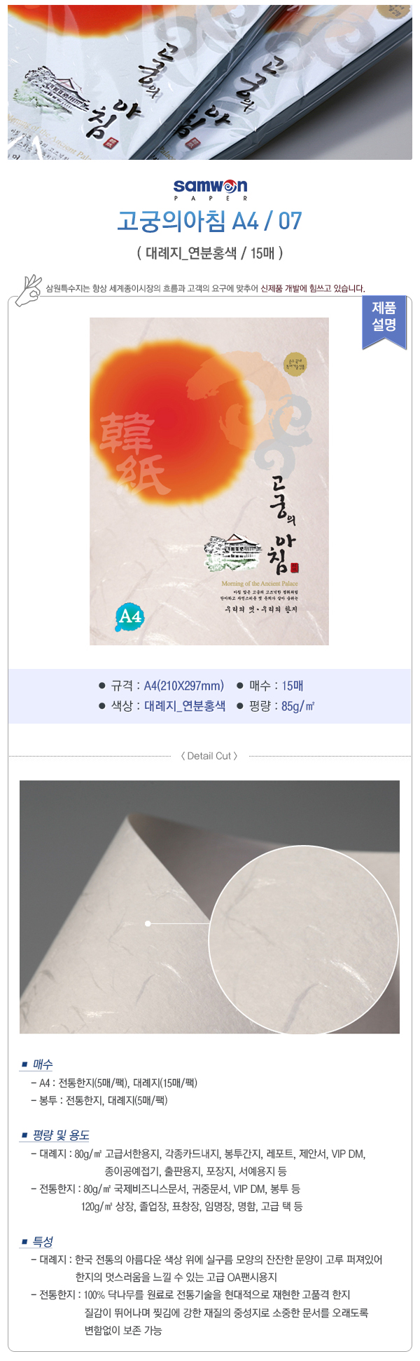 평량 및 용도: 80g - 고급서한용지, 각종 카드 내지, 봉투, 간지, 레포트, 제안서, VIP DM, 종이공예/접기, 출판용지, 포장지, 서예용지 등