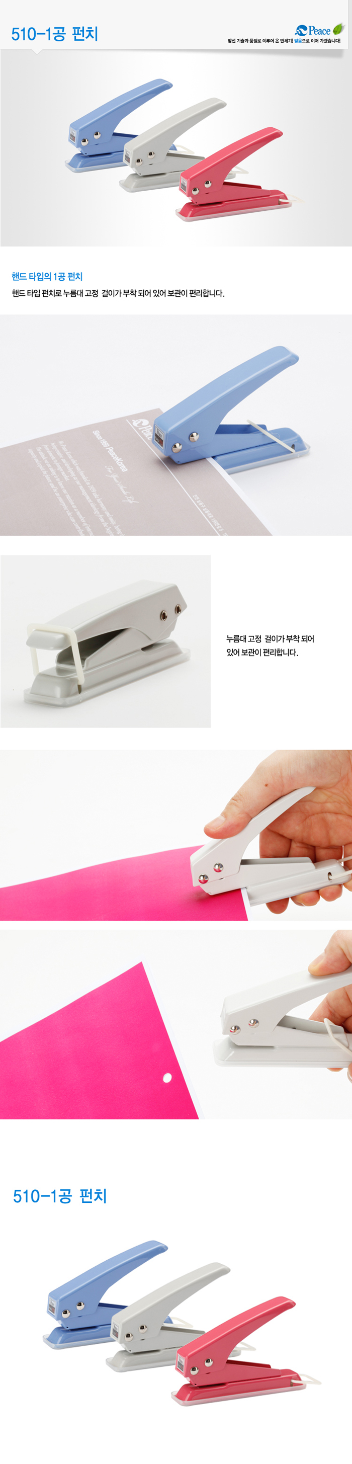 - 문서를 화일/바인더에 보관할 수 있도록 공(구멍)을 만들어 준다. - 누름대에 고정걸이 부착 - 15매 이하 ■ 품명 및 모델명: 1공펀치(510/평화) ■ 법에 의한 인증, 허가 등을 받았음을 확인할 수 있는 경우 그에 대한 사항: 해당없음 ■ 제조국 또는 원산지: 대만 ■ 수입여부: 피스코리아 ■ 연락처: 1566-5411 ■ 안전인증여부: 해당없음