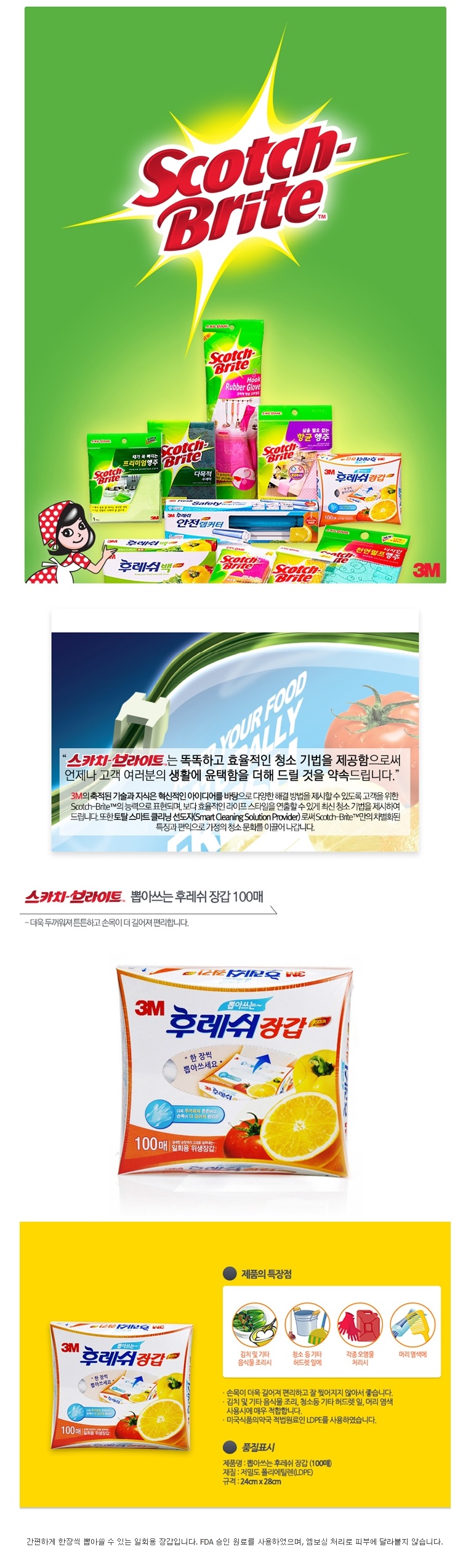 간편하게 한장씩 뽑아쓸 수 있는 일회용 장갑입니다. FDA 승인 원료를 사용하였으며, 엠보싱 처리로 피부에 달라붙지 않습니다.