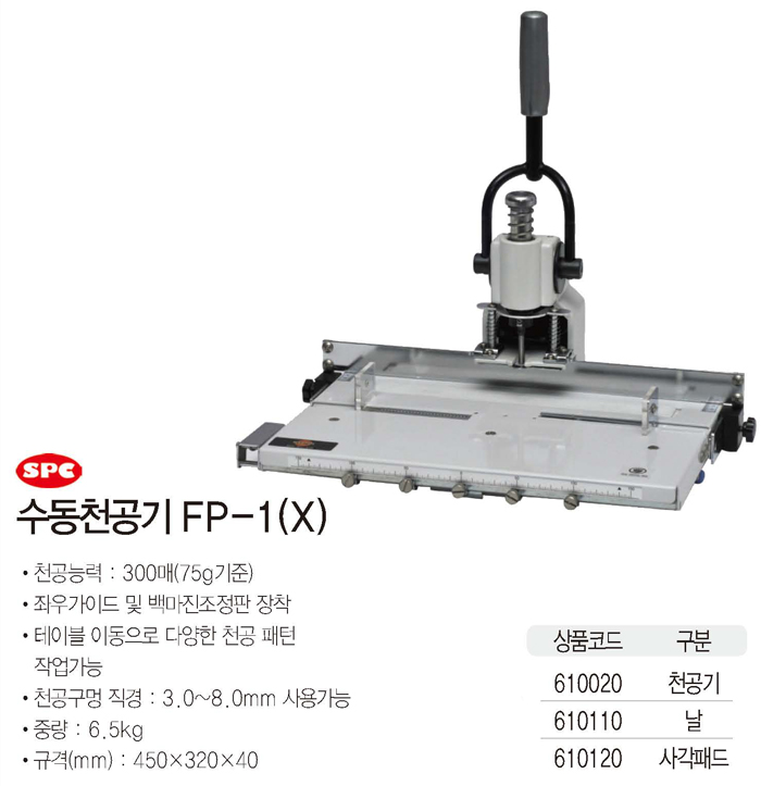* 제품특징 - FP-1(B), FP-1(X) 겸용 날 - 규격 : 6mm ■ 품명 및 모델명: 수동천공기날(FP-1(B),FP-1(X)겸용/6mm) ■ 법에 의한 인증, 허가 등을 받았음을 확인할 수 있는 경우 그에 대한 사항: 해당없음 ■ 제조국 또는 원산지: 중국 ■ 수입여부: ㈜에스.피.씨 ■ 안전인증여부: 해당없음