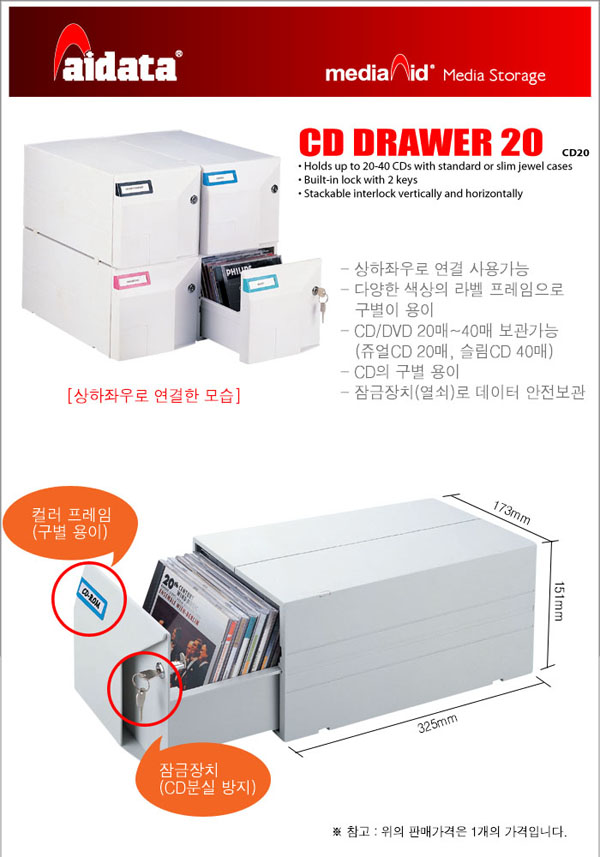- Model No. CD-20 - CD 20매 보관(슬림 40장) - 잠금장치 - 여러개의 보관함을 상,하,좌,우로 쌓을 수 있음. - 공간활용의 극대화(2단,3단 적재가능) - 박스 형태의 서랍식 CD 보관함.
