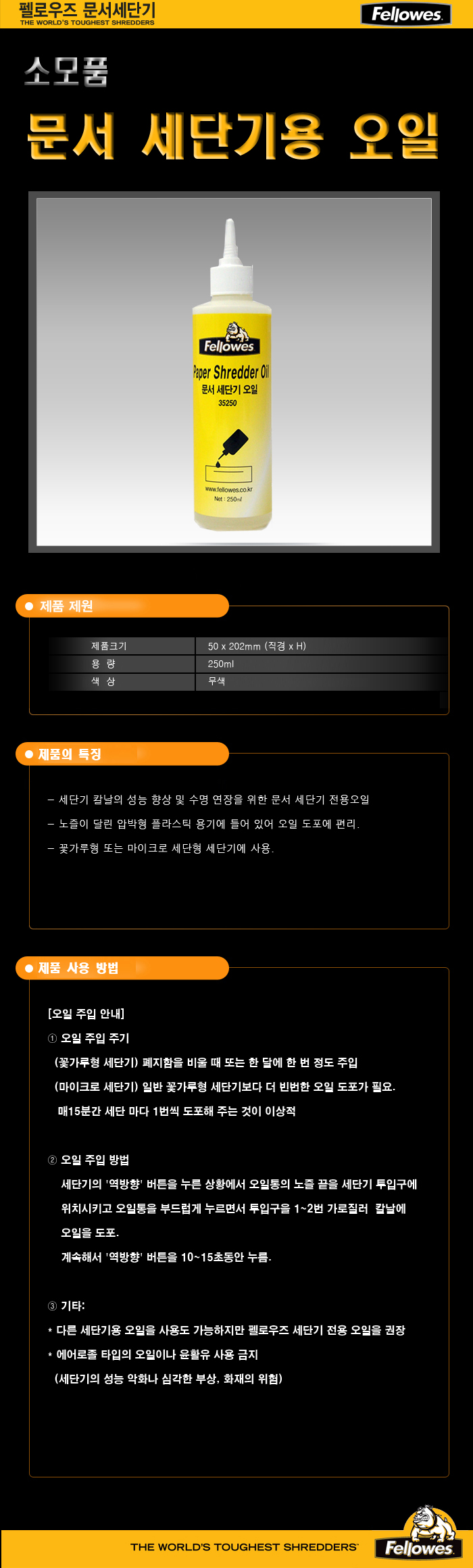 용량 : 250mm - 세단기 칼날의 성능 향상 및 수명 연장을 위한 식물성 전용오일 - 노즐이 달린 압박형 플라스틱 용기에 들어 있어 오일 도포에 편리. - 꽃가루형 또는 마이크로 세단형 세단기에 사용. [오일 주입 안내] ① 오일 주입 주기 (꽃가루형 세단기) 폐지함을 비울 때 또는 한 달에 한 번 정도 주입 (마이크로 세단기) 일반 꽃가루형 세단기보다 더 빈번한 오일 도포가 필요. 매15분간 세단 마다 1번씩 도포해 주는 것이 이상적 ② 오일 주입 방법 세단기의 역방향 버튼을 누른 상황에서 오일통의 노즐 끝을 세단 투입구에 위치시키고 오일통을 부드럽게 누르면서 투입구을 1~2번 가로질러 칼날에 오일을 도포. 계속해서 역방향 버튼을 10~15초동안 누름. ③ 기타: * 다른 세단기용 오일을 사용도 가능하지만 펠로우즈 세단기 전용 오일을 권장 * 에어로졸 타입의 윤할유/석유 계열 오일,윤활유 사용 금지 (세단기의 성능 악화나 심각한 부상, 화재의 위험)