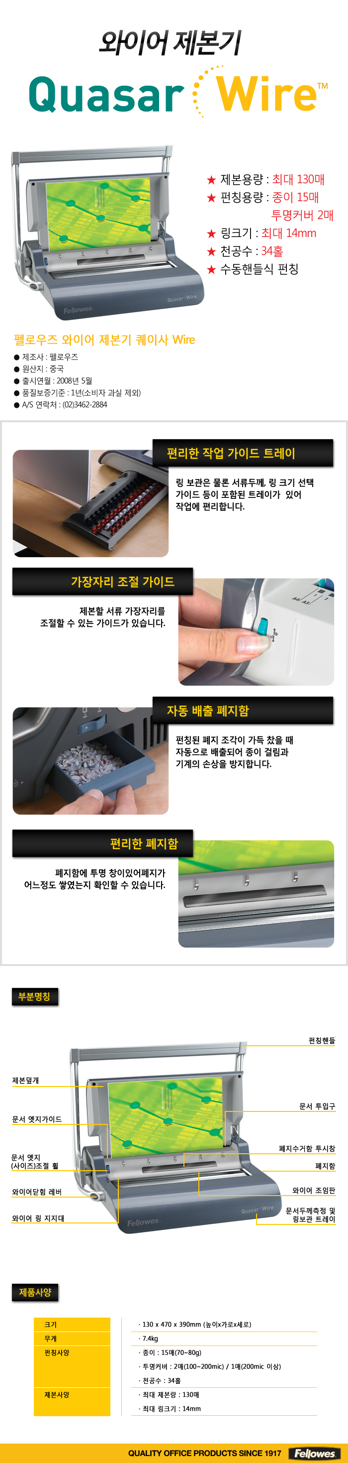 ■ 품명 및 모델명 : 와이어제본기(QuasarWire/펠로우즈) ■ KCC인증대상 여부 : 해당없음 ■ 정격전압 소비전력 에너지소비효율등급 : 해당없음 ■ 동일모델 출시연도 : 2008년05월 ■ 수입여부 : ㈜펠로우즈코리아 ■ 제조국 : 중국 ■ 크기/무게 : 470*390*130/7.4kg ■ 주요사양 : ■ 품질보증기준 : 1년 ■ A/S책임자와전화번호 : ㈜펠로우즈 코리아 / 02-3462-2884