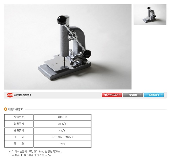 특징- 공크기 : 4mm- 천공두께 : 25mm ■ 품명 및 모델명: 속관기(1공/ASD-S/아톰/4mm) ■ 법에 의한 인증, 허가 등을 받았음을 확인할 수 있는 경우 그에 대한 사항: 해당없음 ■ 제조국 또는 원산지: 대한민국 ■ 수입여부: 해당없음 ■ 안전인증여부: 해당없음
