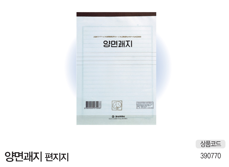 * 제품특징 - 양면괘지(편지지) ■ 품명 및 모델명: 양면괘지(편지지) ■ 법에 의한 인증, 허가 등을 받았음을 확인할 수 있는 경우 그에 대한 사항: 해당없음 ■ 제조국 또는 원산지: 국산 ■ 수입여부: 해당없음 ■ 안전인증여부: 해당없음