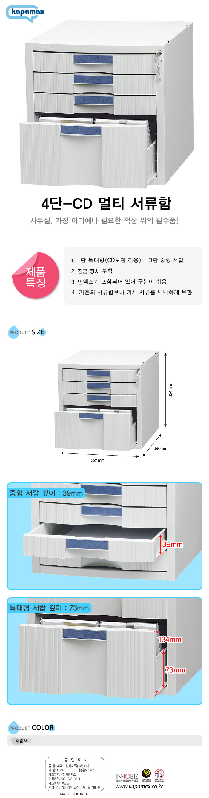 - 잠금장치 있음 ■ 품명 및 모델명: 4단 멀티서류함(CD+3D/카파맥스) ■ 법에 의한 인증, 허가 등을 받았음을 확인할 수 있는 경우 그에 대한 사항: 해당없음 ■ 제조국 또는 원산지: 대한민국 ■ 수입여부: 해당없음 ■ 안전인증여부: 해당없음