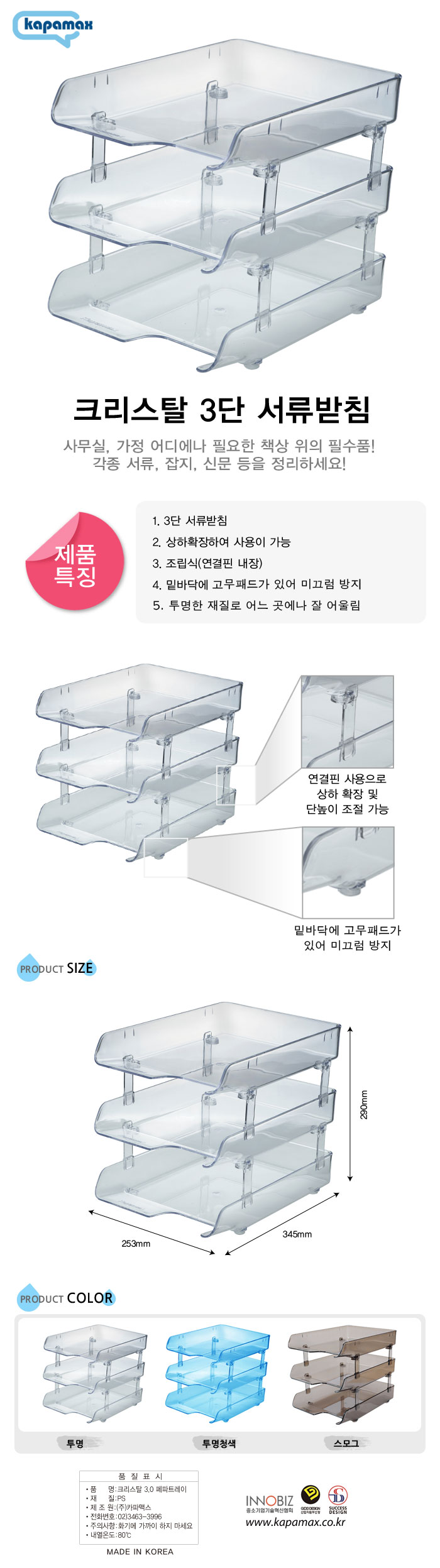 - 조립하기가 간편하며 연결고리가 견고함■ 품명 및 모델명: 크리스탈서류받침(3단/투명/Kapamax) ■ 법에 의한 인증, 허가 등을 받았음을 확인할 수 있는 경우 그에 대한 사항: 해당없음 ■ 제조국 또는 원산지: 대한민국 ■ 수입여부: 해당없음 ■ 안전인증여부: 해당없음