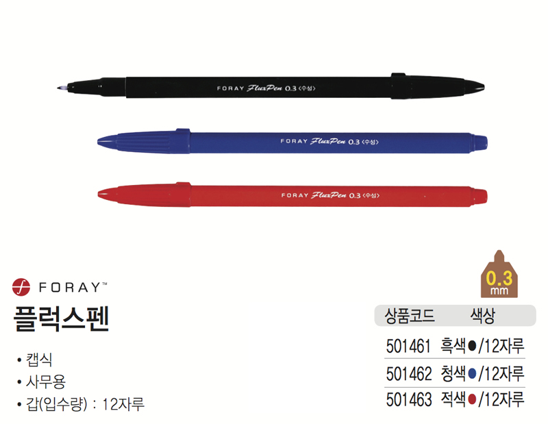 ★ 규격 :0.8mm/흑색/12자루 ★ 재질 : 수성펜 ★ 특징 : 사무용 잘 뭉개지지 않는 펜촉 ■ 품명 및 모델명: 플럭스펜(흑색/12자루/FORAY) ■ 법에 의한 인증, 허가 등을 받았음을 확인할 수 있는 경우 그에 대한 사항: 해당없음 ■ 제조국 또는 원산지: 대한민국 ■ 수입여부: 해당없음 ■ 안전인증여부: N