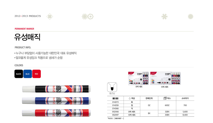 캡식 색상 : 적색 판매단위 : 1타(12자루) 사무용, 학습용 알코올계 유성잉크 적용으로 냄새가 순함 ■ 품명 및 모델명: 유성매직(적/12자루/모나미) ■ 법에 의한 인증, 허가 등을 받았음을 확인할 수 있는 경우 그에 대한 사항: 해당없음 ■ 제조국 또는 원산지: 대한민국 ■ 수입여부: 해당없음 ■ 안전인증여부: N