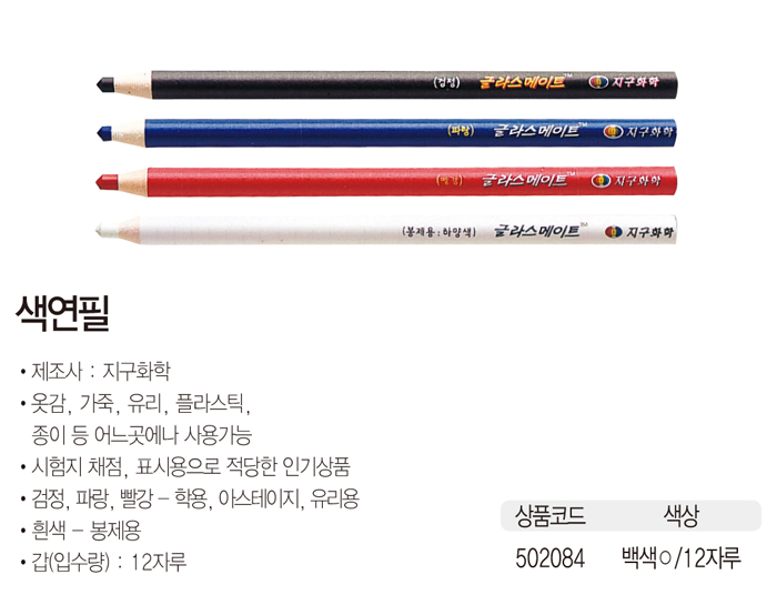 - 유리, 나무, 플라스틱 등 어느 곳에나 사용가능- 단위 : 다스(12자루) ■ 품명 및 모델명: 색연필(백/12자루/지구화학) ■ 법에 의한 인증, 허가 등을 받았음을 확인할 수 있는 경우 그에 대한 사항: KPS ■ 제조국 또는 원산지: 대한민국 ■ 수입여부: 해당없음 ■ 안전인증여부: B441A003-7002A
