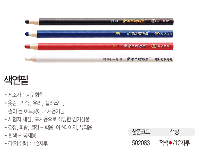 - 유리, 나무, 플라스틱 등 어느 곳에나 사용가능- 단위 : 다스(12자루) ■ 품명 및 모델명: 색연필(적/12자루/지구화학) ■ 법에 의한 인증, 허가 등을 받았음을 확인할 수 있는 경우 그에 대한 사항: KPS ■ 제조국 또는 원산지: 대한민국 ■ 수입여부: 해당없음 ■ 안전인증여부: B441A003-7002A