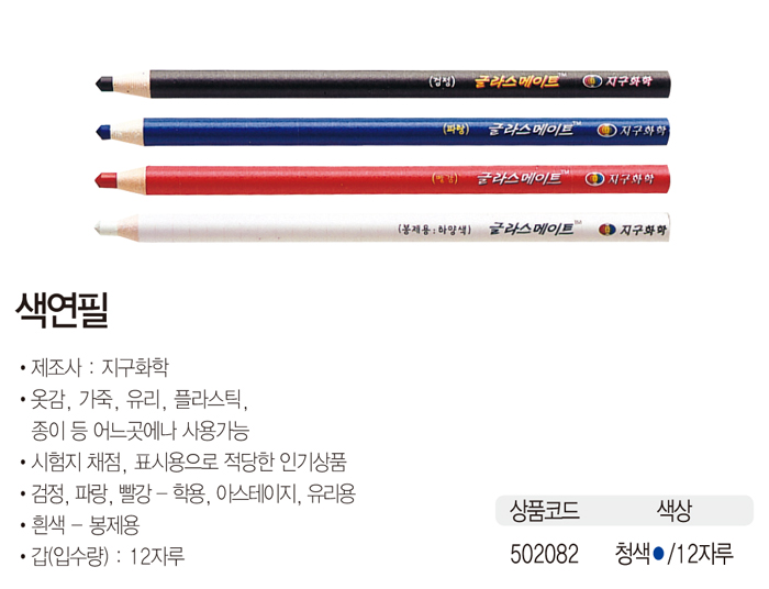 - 유리, 나무, 플라스틱 등 어느 곳에나 사용가능- 단위 : 다스(12자루) ■ 품명 및 모델명: 색연필(청/12자루/지구화학) ■ 법에 의한 인증, 허가 등을 받았음을 확인할 수 있는 경우 그에 대한 사항: KPS ■ 제조국 또는 원산지: 대한민국 ■ 수입여부: 해당없음 ■ 안전인증여부: B441A003-7002A