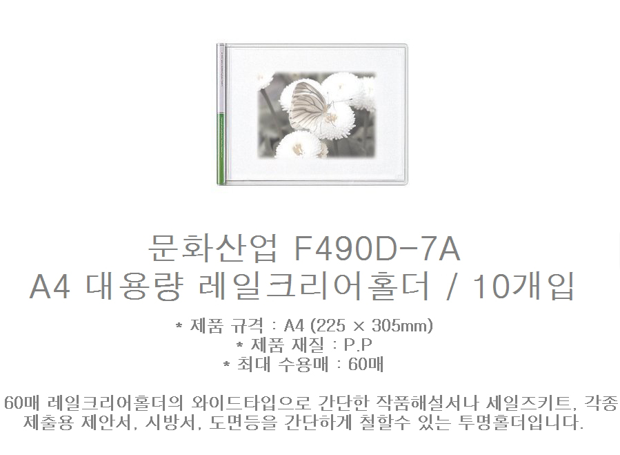 ◎ 상품 상세설명 - 규격 : A4(50매 수용) - 상철 - 색상 : 투명 - 대용량 쫄대를 사용하여 기존 쫄대화일에 비해 많은 양의 자료를 보관할 수 있음 - 쫄대를 끼우는 방식으로 내용물의 가감이 용이 ◎ 상품정보고시 ■ 법에 의한 인증 사항 - 해당없음 ■ 제조국 또는 원산지 - 대한민국 ■ 수입여부 - 해당없음 ■ 안전인증여부 - N