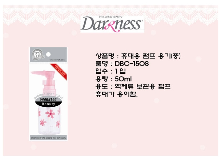 액체 내용을 넣은 후 펌프로 사용 휴대가 간편함 ■ 품명 및 모델명: 휴대용 펌프 용기(중/DBC-1508/다크니스) ■ 법에 의한 인증, 허가 등을 받았음을 확인할 수 있는 경우 그에 대한 사항: 해당없음 ■ 제조국 또는 원산지: 중국 ■ 수입여부: 수입 ■ 안전인증여부: N