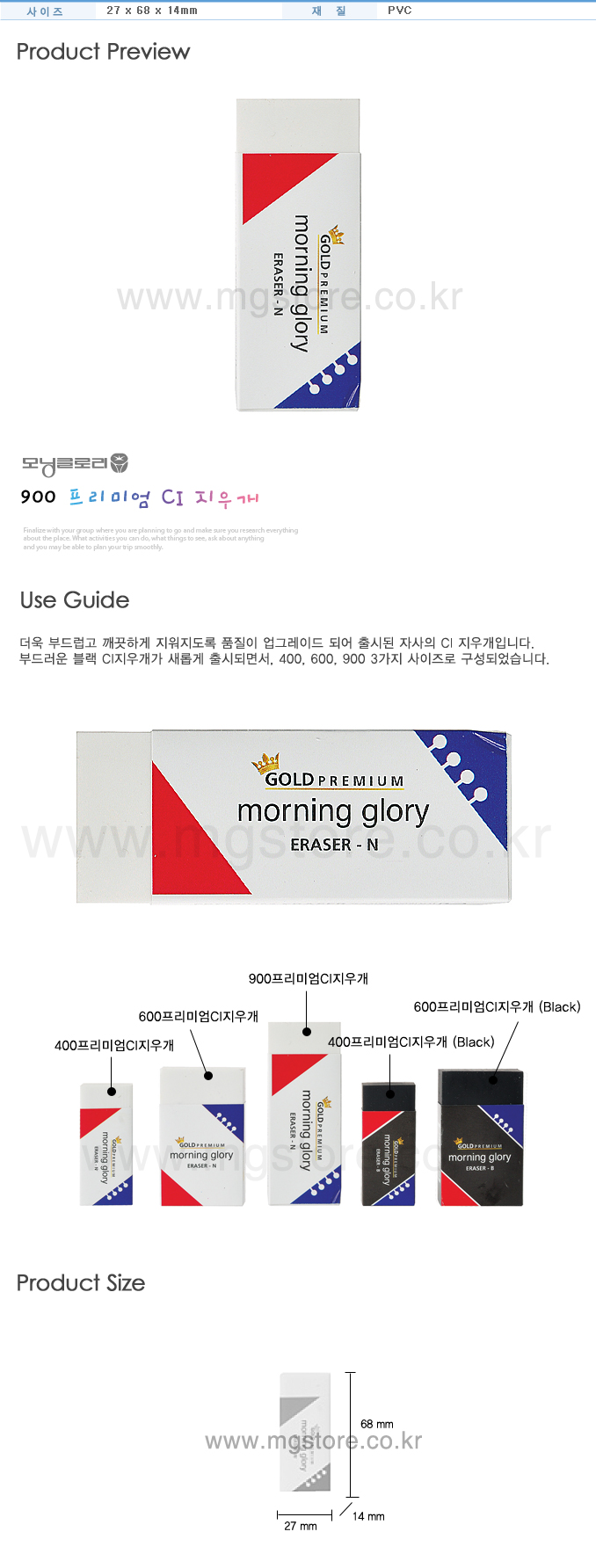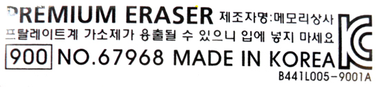 *규격 : 대(66*29*11mm) *단위 : 1개입 *사무용지우개 ■ 품명 및 모델명: 프리미엄CI지우개(900/대/모닝) ■ 법에 의한 인증, 허가 등을 받았음을 확인할 수 있는 경우 그에 대한 사항: KPS 자율안전 확인 표시 ■ 제조국 또는 원산지: 대한민국 ■ 수입여부: 해당없음 ■ 안전인증여부: 04◆B441L005-9001A