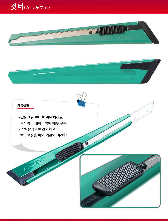 특징 - 날의 3단 연마후 광택처리로 절삭력과 내마모성이 매우 우수 - 스틸칼집으로 견고하고 칼라코팅을 하여 외관이 미려함 ■ 품명 및 모델명: 컷터(A1/도루코) ■ 법에 의한 인증, 허가 등을 받았음을 확인할 수 있는 경우 그에 대한 사항: 해당없음 ■ 제조국 또는 원산지: 국산 ■ 수입여부: 해당없음 ■ 안전인증여부: 해당없음