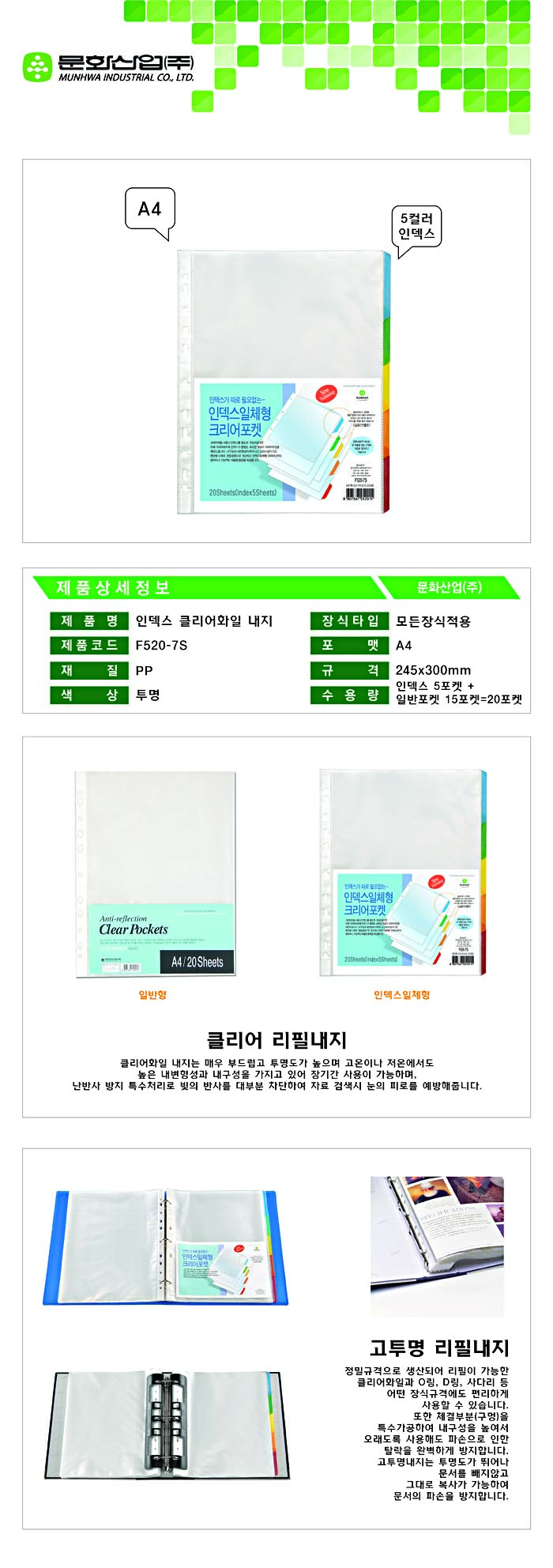 인덱스 클리어화일 내지(A4/20매/F520-7S/문화산업)/팩