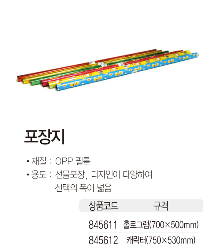 용도 ; 선물포장,디자인이 다양하여 선택의 폭이 넓음 ■ 품명 및 모델명 : 케릭터증착포장지1입 ■ 법에 의한 인증, 허가 등을 받았음을 확인할 수 있는 경우 그에 대한 사항: 해당없음 ■ 제조국 또는 원산지: 중국 ■ 수입여부: 수입 ■ 안전인증여부: N