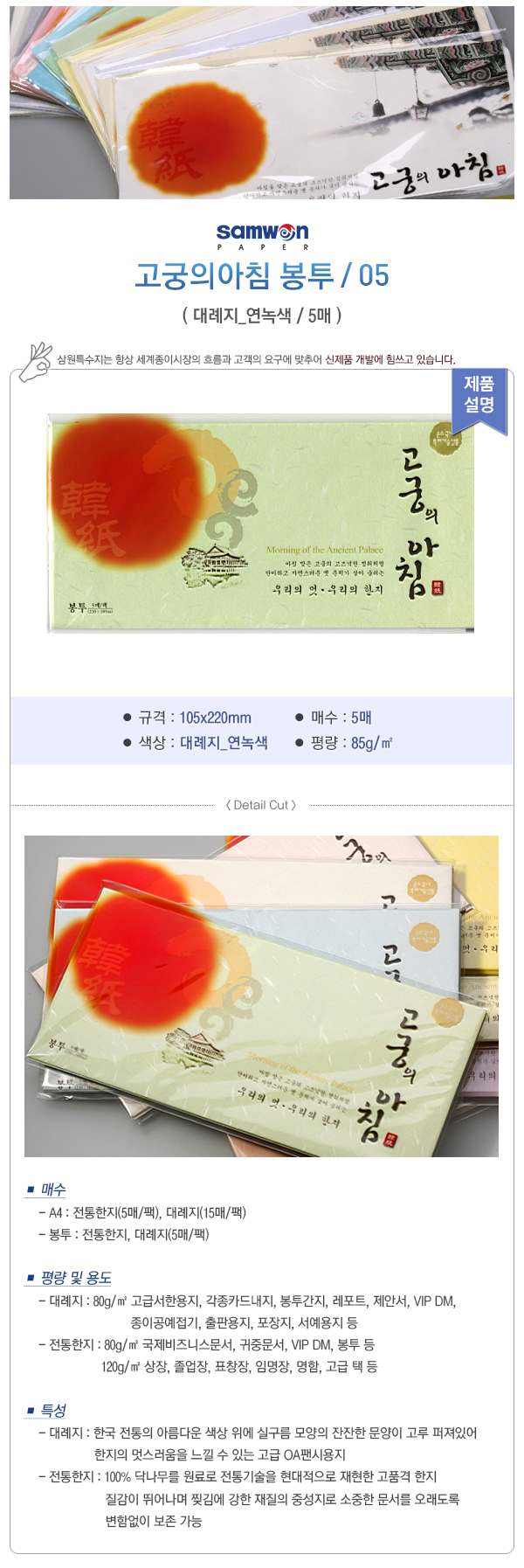 <봉투>* 연녹색* 규격:105*220mm* 평량:85g■ 품명 및 모델명: 고궁의아침봉투(105*220/대례지/05)■ 법에 의한 인증, 허가 등을 받았음을 확인할 수 있는 경우 그에 대한 사항: 해당없음■ 제조국 또는 원산지: 국내■ 수입여부: 해당없음■ 안전인증여부: 해당없음