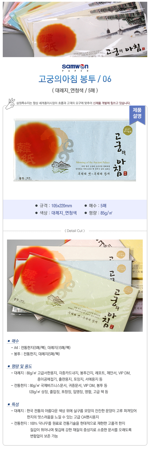 <봉투>* 연청색* 규격:105*220mm* 평량:85g■ 품명 및 모델명: 고궁의아침봉투(105*220/대례지/06)■ 법에 의한 인증, 허가 등을 받았음을 확인할 수 있는 경우 그에 대한 사항: 해당없음■ 제조국 또는 원산지: 국내■ 수입여부: 해당없음■ 안전인증여부: 해당없음