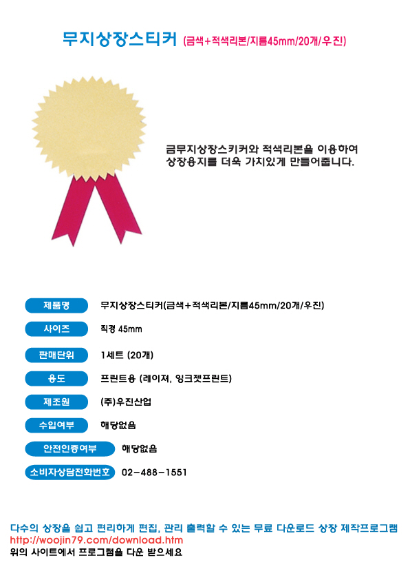 -상품정보고시 *품명및모델명 - 무지상장스티커(금색+적색리본/지름45mm/20개) *법에의한 인증 - 해당없음 *제조국or 원산지 - 대한민국 *수입여부 - 해당없음 *안전인증여부 - N
