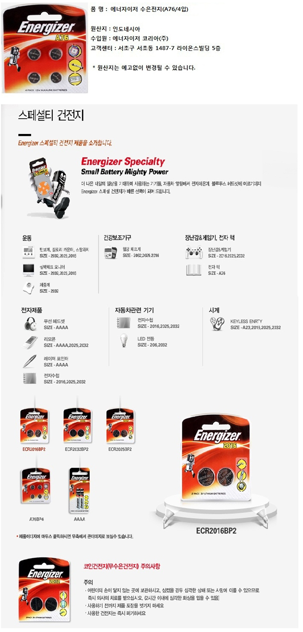 ■ 품명 및 모델명: 신)에너자이저 수은전지(A76/4입) ■ 법에 의한 인증, 허가 등을 받았음을 확인할 수 있는 경우 그에 대한 사항: 해당없음 ■ 제조국 또는 원산지: 인도네시아산 ■ 수입여부: 수입 ■ 안전인증여부: N
